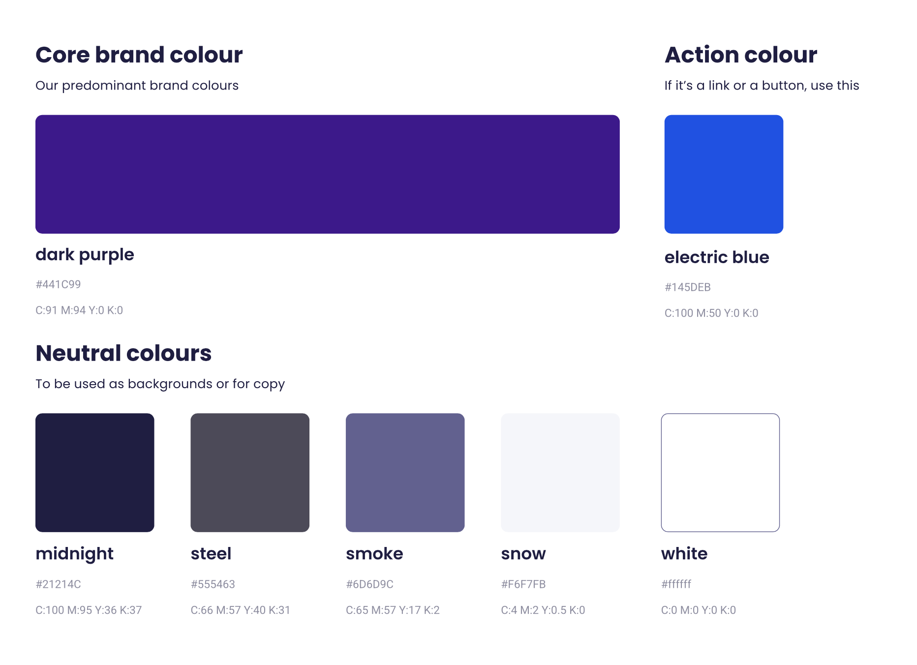 Great example of the color palette at work. While purple is the primary, we do have a set of colors that work along side it. The logo, “wave” element and typography maintain familiarity and consistency.